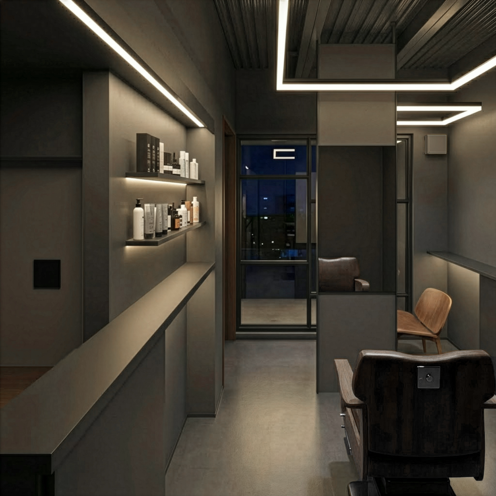 昔ながらの商店街に佇む、完全予約制・一席のみのプライベートヘアサロンの計画です。カット・シェービングに加え、最新設備によるヘッドスパを提供するサロンとして、2つの対照的な空間を巡る特別な体験をデザインしました。
