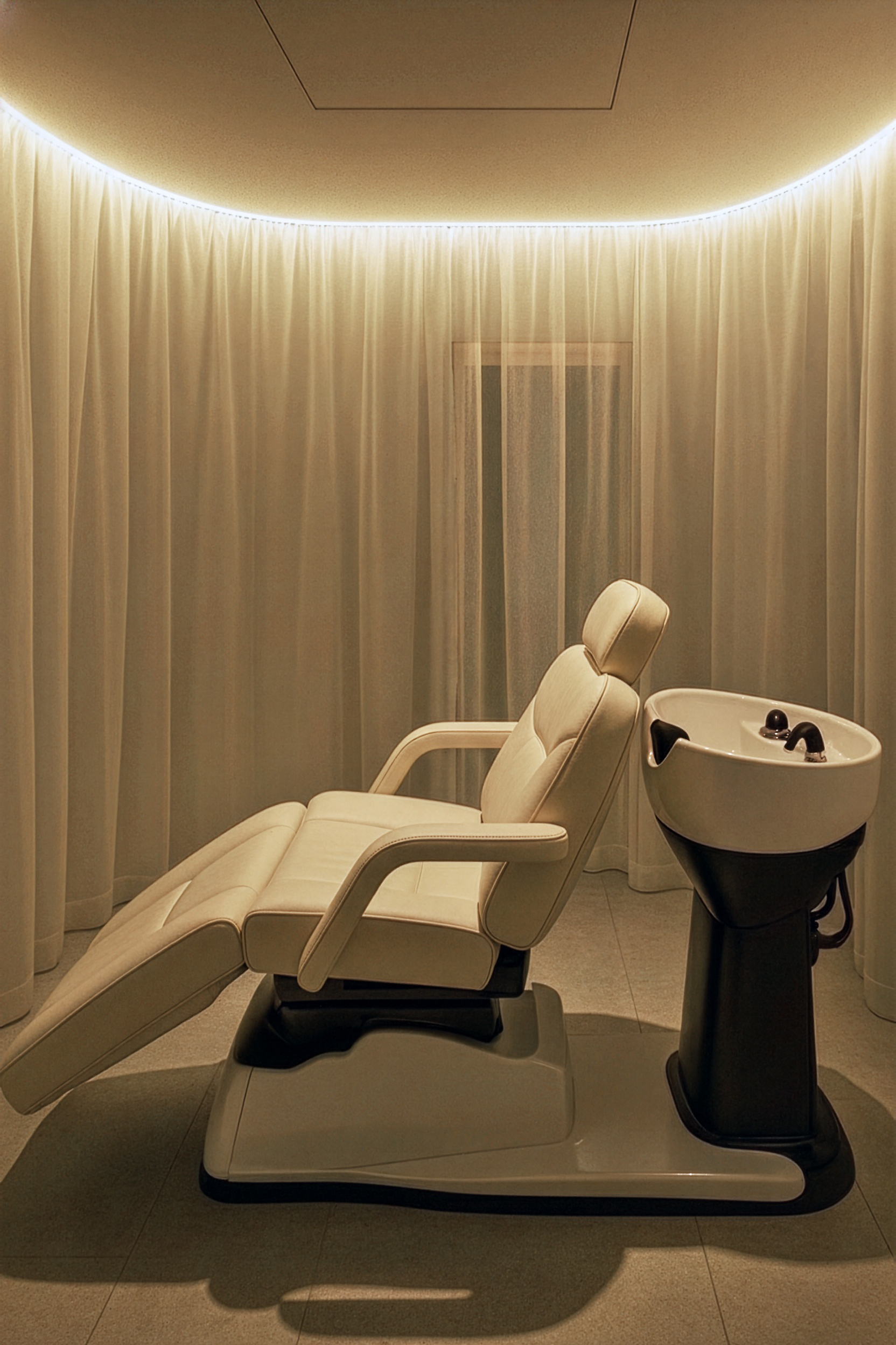 カットエリアから扉を一枚隔てた先にあるのは、ホワイトを基調としたスパエリア。円形のカーテンに包まれた柔らかな光の空間が広がり、訪れる人をさらなる癒しへと誘います。